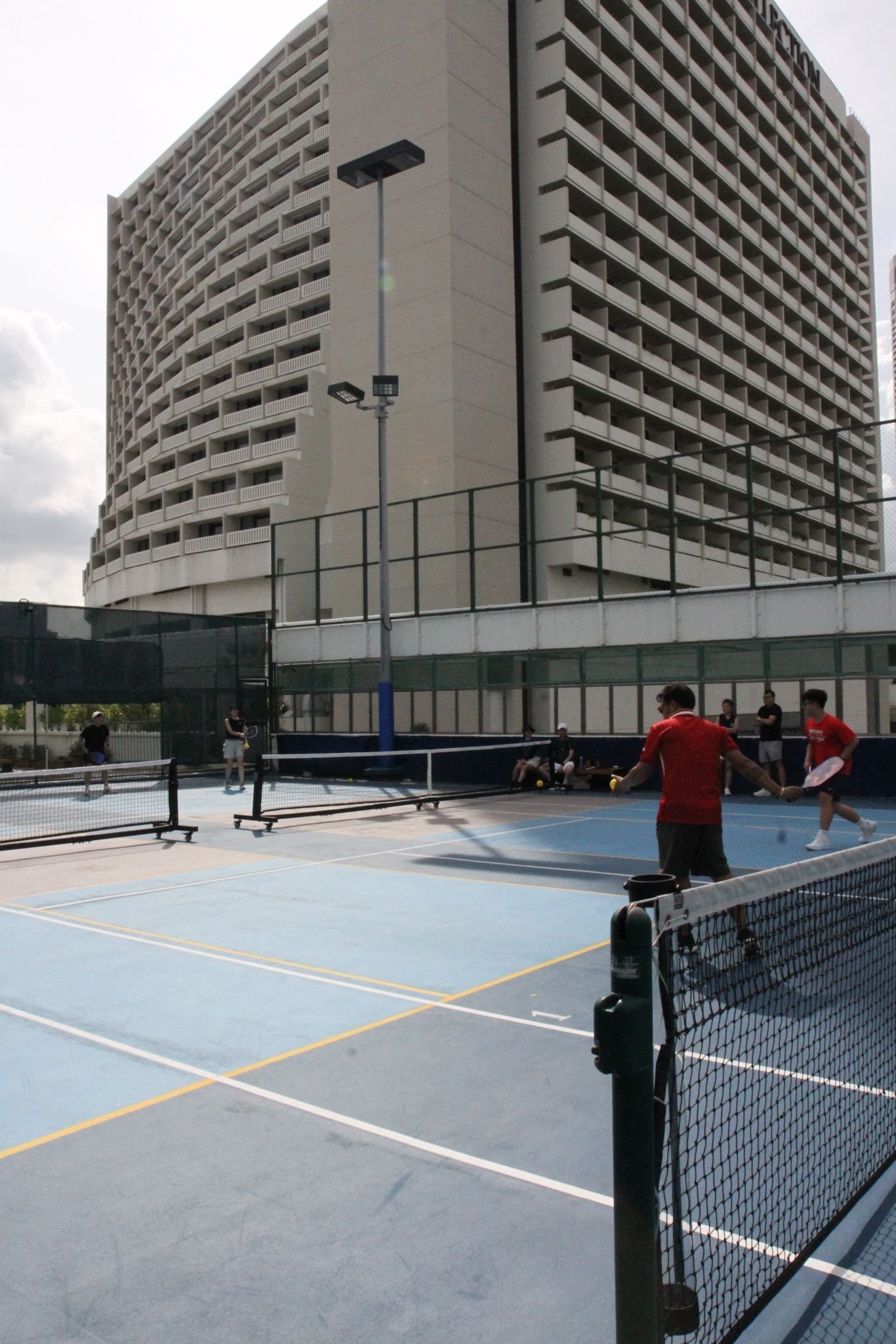Locate Delifrance on Level 2 between Towers 2 and Tower 3. Access Lobby M2b service lift. Take the lift to level 4 to access the Pickleball Courts..